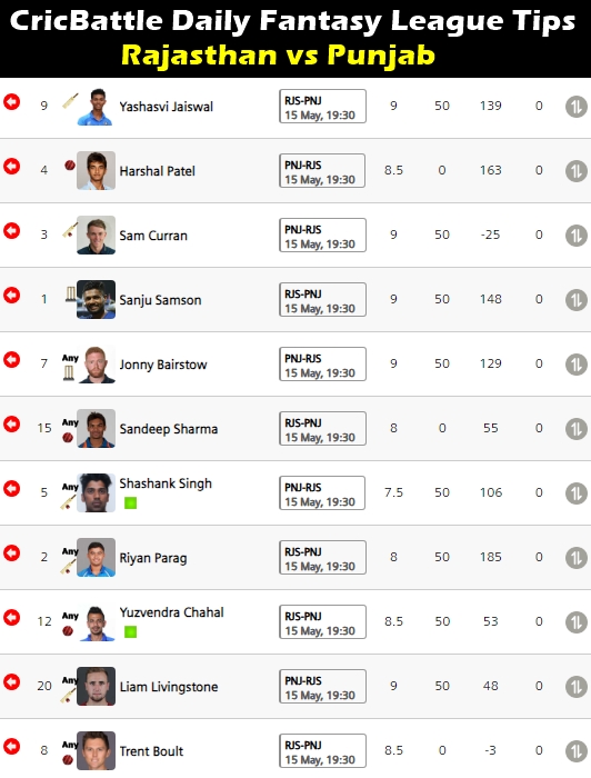 My XI – Sanju Samson (Captain), Jonny Bairstow (Vice-Captain), Sandeep Sharma, Harshal Patel, Yashasvi Jaiswal, Sam Curran, Riyan Parag, Shashank Singh, Y Chahal, Trent Boult, Liam Livingstone