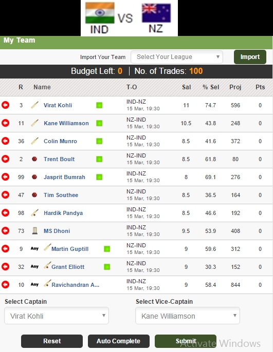 · My XI – Virat Kohli (Captain), Kane Williamson ( Vice-Captain), Colin Munro, Hardik Pandya, Martin Guptil, Grant Elliot, MS Dhoni, Trent Boult, Jasprit Bumrah, Tim Southee, R Ashwin.