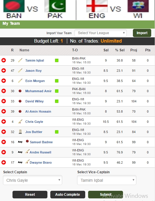 My XI – Chris Gayle (Captain), Tamim Iqbal ( Vice-Captain), Jos Buttler, Mohammad Amir, Jason Roy, Eoin Morgan, David Willey, Al-Amin Hossain, Samuel Badree, Andre Russell, Dwayne Bravo