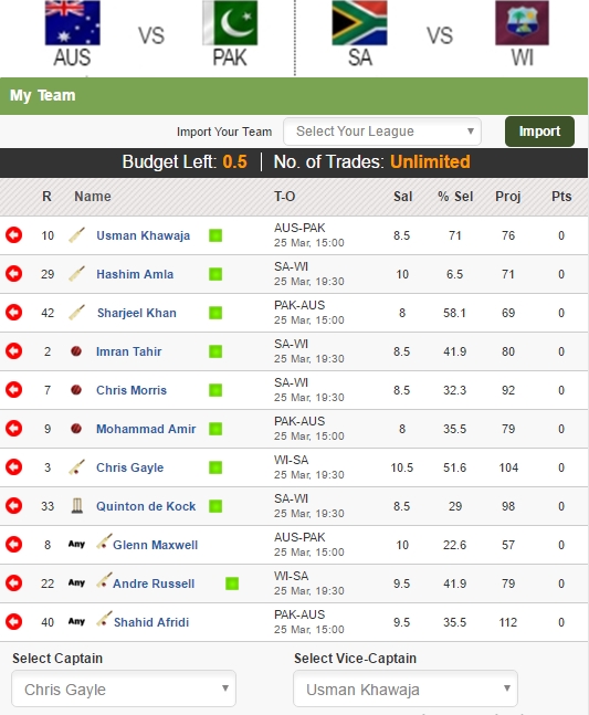 My XI – Chris Gayle (Captain), Usman Khawaja ( Vice-Captain), Quinton de kock, Glenn Maxwell, Imran Tahir, Hashim Amla, Sharjeel Khan, Chris Morris, Mohammad Amir, Andre Russell, Shahid Afridi