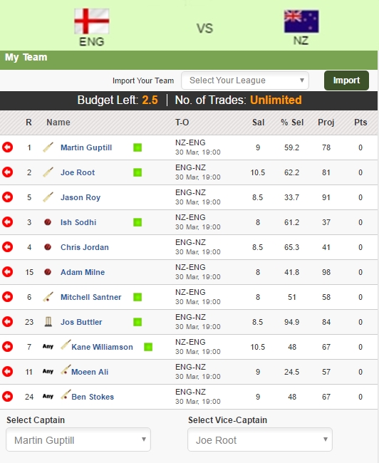 · My XI – Martin Guptil (Captain), Joe Root ( Vice-Captain), Mitchell Santner, Jos Buttler, Ish Sodhi, Jason Roy, Kane Williamson, Chris Jordan, Moeen Ali, Adam Milne, Ben Stokes.