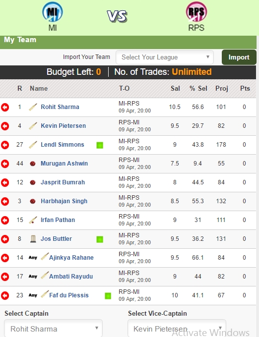 My XI – Rohit Sharma (Captain), Kevin Pietersen ( Vice-Captain), Jos Buttler, Lendl Simmons, Murugan Ashwin, Jasprit Bumrah, Harbhajan Singh, Ajinkya Rahane, Ambati Rayudu, Faf du Plessis, Irfan Pathan