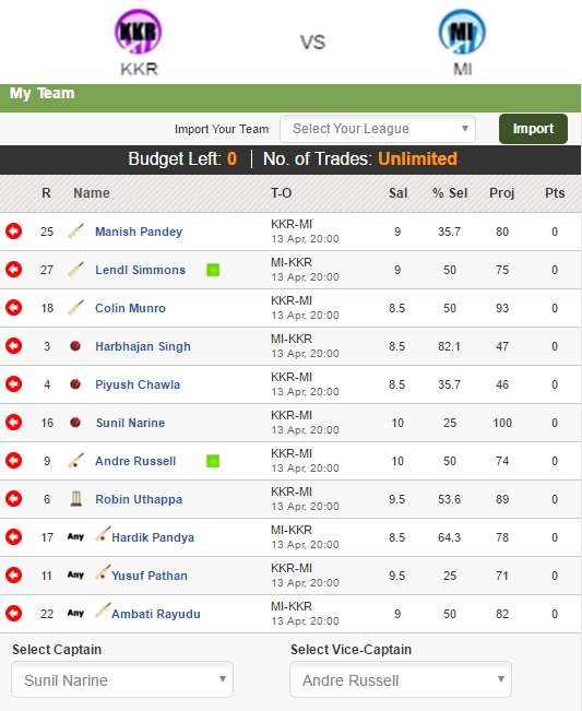 My XI – Sunil Narine (Captain), Andre Russell (Vice-Captain), Manish Pandey, Lendl Simmons, Harbhajan Singh, Piyush Chawla, Robin Uthappa, Colin Munro, Hardik Pandya, Yousuf Pathan, Ambati Rayudu