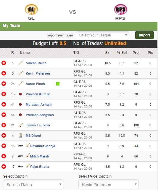 My XI – Suresh Raina (Captain), Kevin Pietersen (Vice-Captain), James Faulkner, Aaron Finch, Praveen Kumar, Murugan Ashwin, Pradeep Sangwan, MS Dhoni, Ravindra Jadeja, Mitch Marsh, Rajat Bhatia