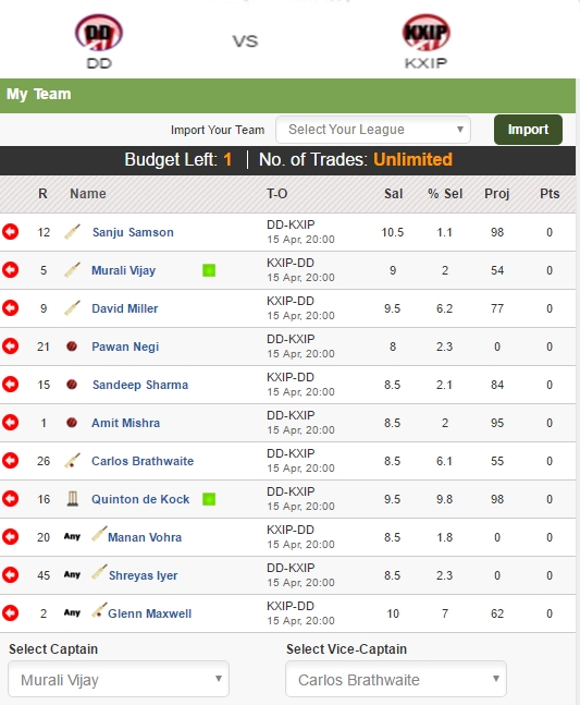 My XI – Murali Vijay (Captain), C Brathwaite (Vice-Captain), Pawan Negi, Sanju Samson, Quinton de Kock, Sandeep Sharma, Amit Mishra, David Miller, Manan Vohra, Shreyas iyer, Glenn Maxwell