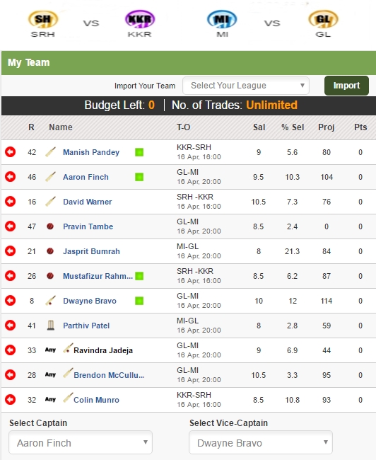 My XI – Aaron Finch (Captain), DJ Bravo (Vice-Captain), Manish Pandey, Pravin Tambe, Parthiv Patel, Jaaprit Bumrah, Mustafizur Rahman, David Warner, Ravindra Jadeja, B McCullum, Colin Munro