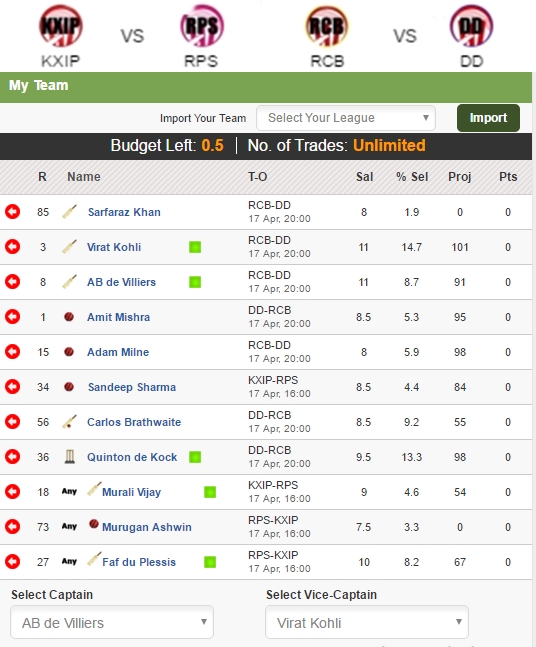 My XI – AB de Villiers (Captain), Virat Kohli (Vice-Captain), Sarfraz Khan, Amit Mishra, Adam Milne, Sandeep Sharma, Quinton de Kock, C Brathwaite, Murali Vijay, Murugan Ashwin, Faf du Plessis