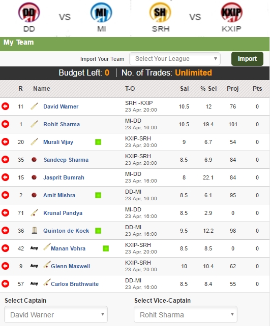 · My XI – David Warner (Captain), Rohit Sharma (Vice-Captain), Krunal Pandya, Sandeep Sharma, Amit Mishra, Jasprit Bumrah, Murali Vijay, Quinton de kock, Manan Vohra, Glen Maxwell, Carlos Brathwaite