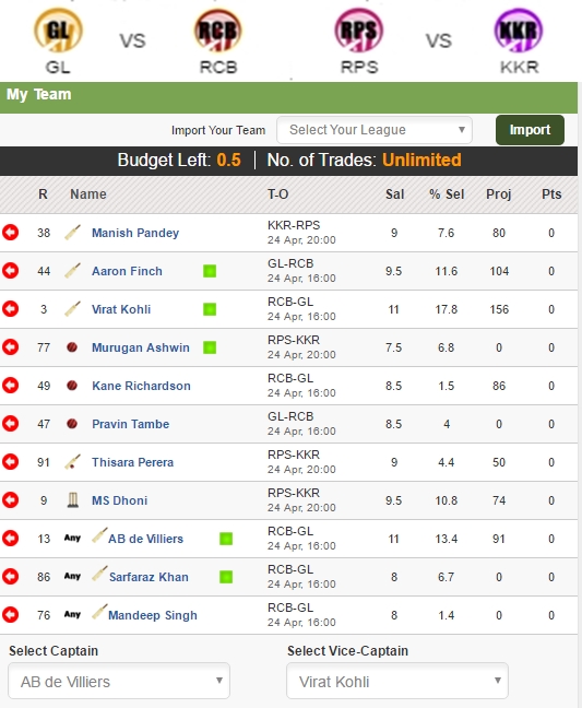 My XI – AB de Villiers (Captain), Virat Kohli (Vice-Captain), Sarfraz Khan, M Ashwin, Kane Richardson, Pravin Tambe, Manish Pandey, Aaron Finch, MS Dhoni, Mandeep Singh, Thisara Perera