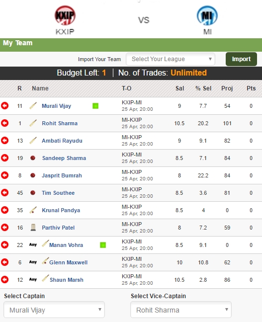 · My XI – Murali Vijay (Captain), Rohit Sharma (Vice-Captain), Krunal Pandya, Sandeep Sharma, Ambati Rayudu, Jasprit Bumrah, Tim Southee, Parthiv Patel, Manan Voghra, Glenn Maxwell, Shaun Marsh