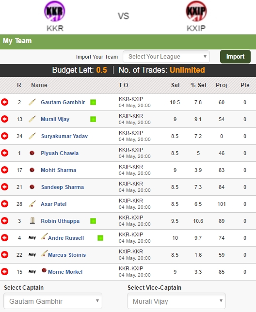 My XI – Gautam Gambhir (Captain), Murali Vijay (Vice-Captain), Robin Uthappa, Axar Patel, Piyush Chawla, Mohit Sharma, Sandeep Sharma, Suryakumar Yadav, Andre Russell, Marcus Stoinis, Morne Morkel