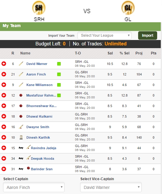 My XI – Aaron Finch (Captain), David Warner (Vice-Captain), Mustafizur Rahman, Dwayne Smith, B Kumar, Dhawal Kulkarni, Dinesh Karthik, Kane Williamson, R Jadeja, Barinder Sran, Deepak Hooda