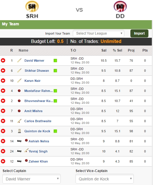 My XI – David Warner (Captain), Quinton de Kock (Vice-Captain), M Rahman, B Kumar, Ashish Nehra, Amit Mishra, C Brathwaite, Shikhar Dhawan, Karun Nair, Yuvraj Singh, Zaheer Khan