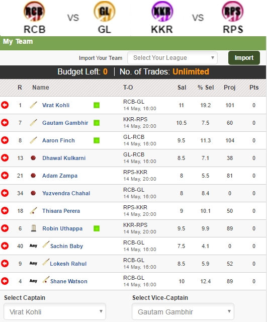 My XI – Virat Kohli (Captain), Gautam Gambhir (Vice-Captain), Thisara Perera, Aaron Finch, D Kulkarni, Adam Zampa, Y Chahal, Robin Uthappa, Sachin Baby, Lokesh Rahul, Shane Watson