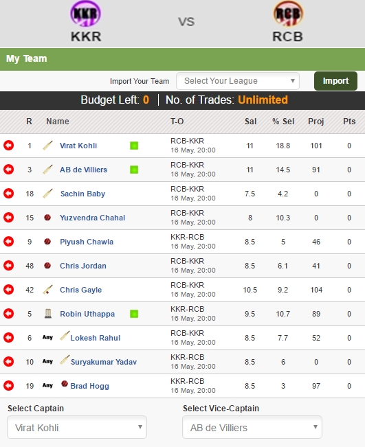 My XI – Virat Kohli (Captain), AB de Villiers (Vice-Captain), Sachin Baby, Chris Gayle, R Uthappa, Y Chahal, P Chawla, Chris Jordan, L Rahul, S Yadav, Brad Hogg