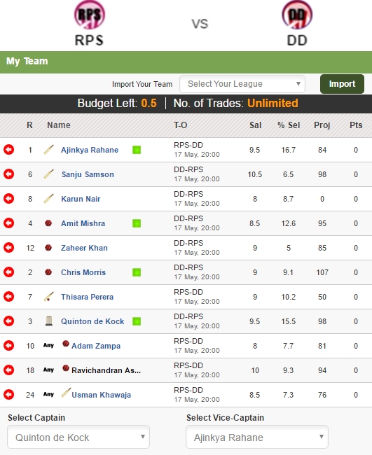 · My XI – Quinton de Kock (Captain), Ajinkya Rahane (Vice-Captain), Amit Mishra, Zaheer Khan, Chris Morris, Sanju Samson, Karun Nair, Thisara Perera, R Ashwin, Adam Zampa, Usman Khawaja.