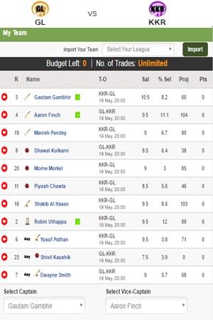 My XI – Gautam Gambhir (Captain), Aaron Finch (Vice-Captain), Shakib Al Hassan, Dhawal Kulkarni, Yousuf Pathan, Robin Uthappa, Manish Pandey, Morne Morkel, Piyush Chawla, Shivil Kaushik, Dwayne Smith