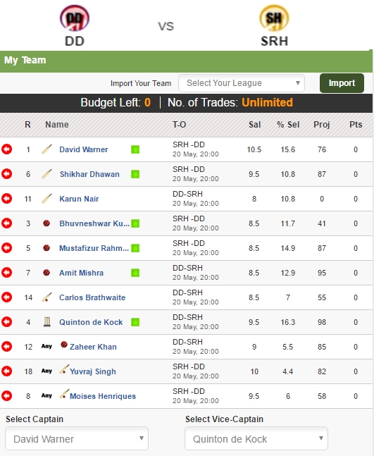 My XI – David Warner (Captain), Quinton de Kock (Vice-Captain), M Rahman, B Kumar, Moises Henriques, Amit Mishra, C Brathwaite, Shikhar Dhawan, Karun Nair, Yuvraj Singh, Zaheer Khan