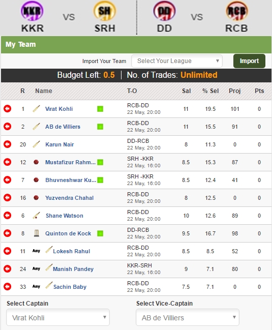 My XI – Virat Kohli (Captain), AB de Villiers (Vice-Captain), M Rahman, Quinton de Kock, B Kumar, Y Chahal, Karun Nair, Shane Watson, Lokesh Rahul, Manish Pandey, Sachin Baby