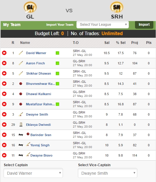 My XI – David Warner (Captain), Dwayne Smith (Vice-Captain), B Kumar, D Kulkarni, M Rahman, Barinder Sran, Eklavya Dwivedi, Aaron Finch, Shikhar Dhawan, Yuvraj Singh, Dwayne Bravo