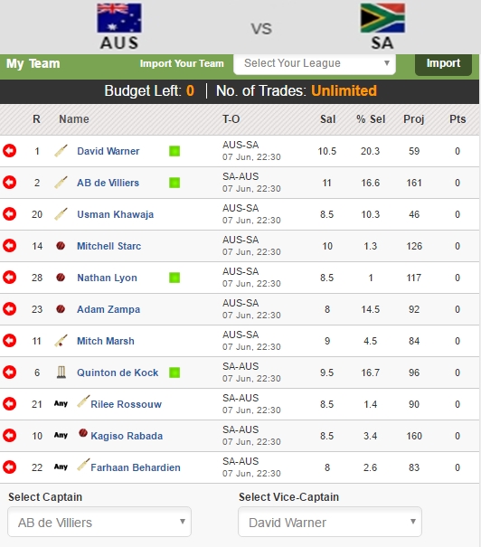 · My XI – AB de Villiers (Captain), David Warner (Vice-Captain), Nathon Lyon, Mitchell Starc, Usman Khawaja, Rilee Rossouw, Kagiso Rabada, Quinton de Kock, Adam Zampa, Farhaan Behardien, Mitch Marsh