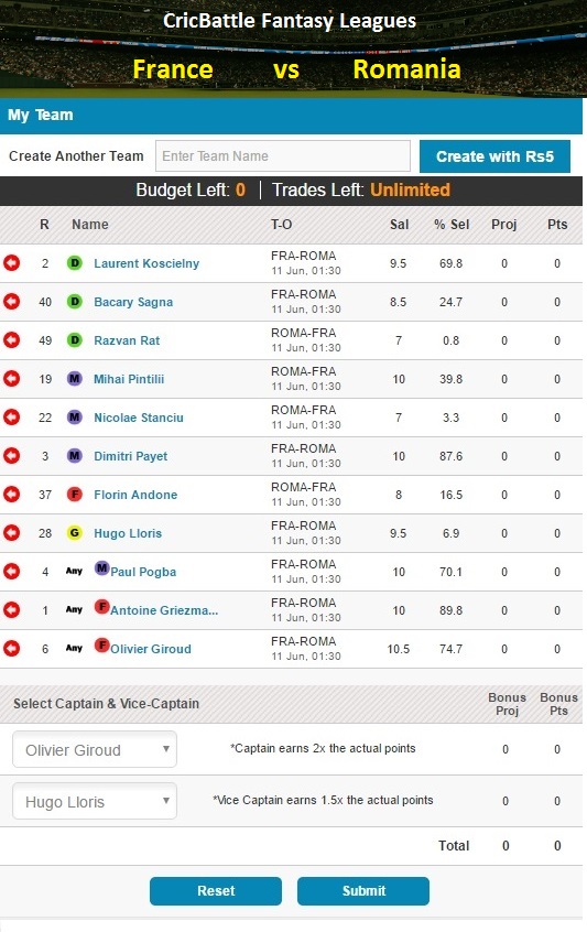 | Cricbattle Daily Fantasy Football League Tips France Vs Romania on June 10 by Siddanth Reddy ,3476 days ago |