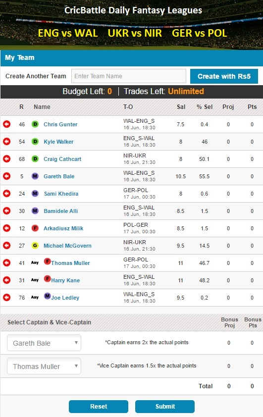 Top captains & vice captains – Gareth Bale who scored from a blistering free kick against Slovakia will come into this game against England with high confidence. The Welsh man could cause problems to England’s defense and is expected to score atleast once. Thomas Muller who had an off game against Ukraine is eager to get on the score sheet and is more likely to make a big impact against Poland.