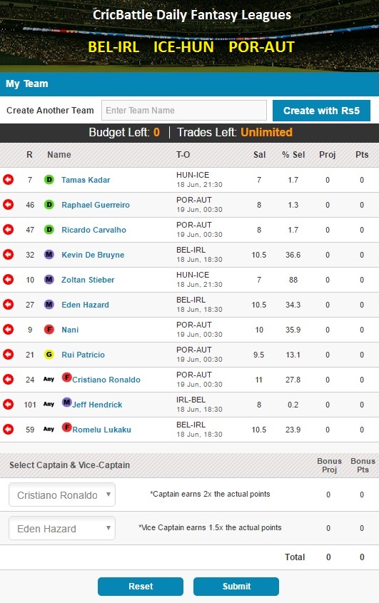 | CricBattle Daily Fantasy Football Leagues Tips : BEL-IRL || ICE-HUN || POR-AUT on June 18 by Siddanth Reddy ,3467 days ago |