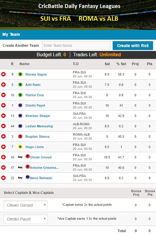 | CricBattle Daily Fantasy Football Leagues Tips : SUI vs FRA || ROMA vs ALB on June 19 by Siddanth Reddy ,3467 days ago |