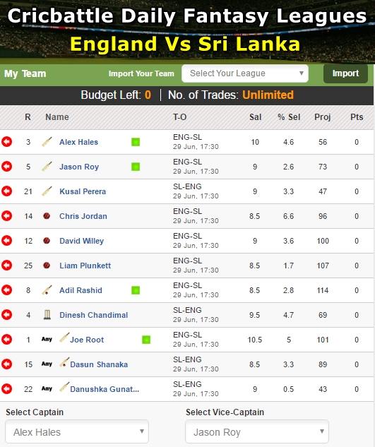 · My XI – Alex Hales (Captain), Jason Roy (Vice-Captain), Adil Rashid, Dinesh Chandimal, Chris Jordan, Liam Plunkett, David Willey, Kusal Perera, Joe Root, Dasun Shanaka, Danushka Gunathilaka