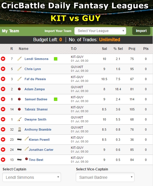 · My XI – Lendl Simmons (Captain), Samuel Badree (Vice-Captain), Adam Zampa, Tabraiz Shamsi, Chris Lynn, Faf du Plessis, Anthony Bramble, D Smith, Kieran Powell, Jonathan Carter, Tino Best
