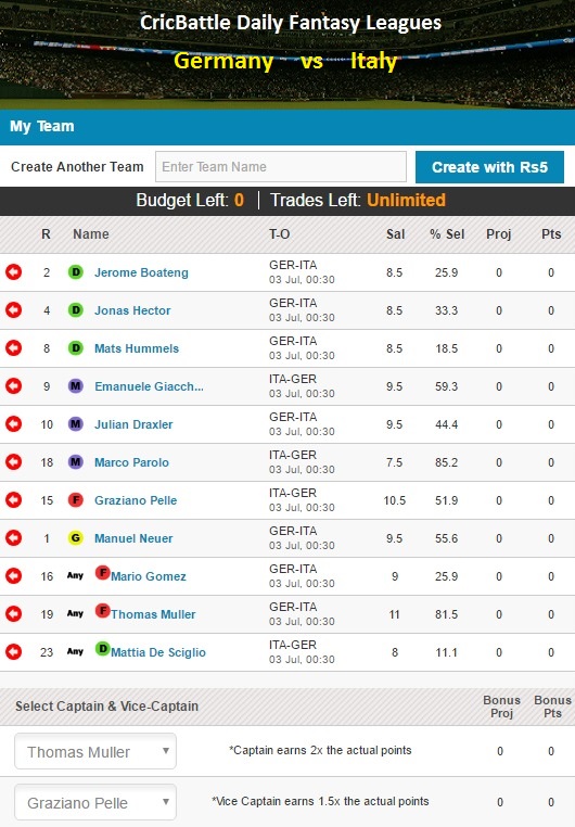Top captains & vice captains – Germany’s main striker Thomas Muller didn’t have a great outing so far. He has just made one assist in their win against Northern Island. He is expected to score goals in this important quarter-final fixture. The Southampton’s giant Graziano Pelle had an impressive start against Belgium and then he continued his form against the mighty Spain and scored the 2nd goal for Italy in dying minutes and sealed their spot for the final 8. He is expected to counter attack against this tough German defense.
