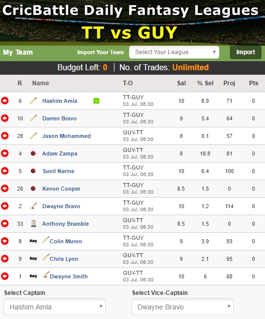 My XI – Hashim Amla (Captain), Dwayne Bravo (Vice-Captain), Adam Zampa, Sunil Narine, Anthony Bramble, Darren Bravo, Jason Mohammed, Kevon Cooper, Colin Munro, Chris Lynn, Dwayne Smith