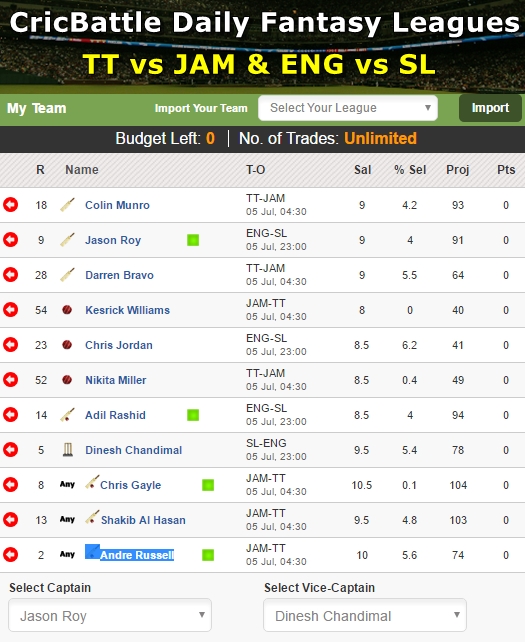 · My XI – Jason Roy (Captain), Dinesh Chandimal (Vice-Captain), Colin Munro, Kesrick Williams, Darren Barovo, Chris Jordan, Nikita Miller, Adil Rashid, Chris Gayle, Shakib Al Hasan, Andre Russell