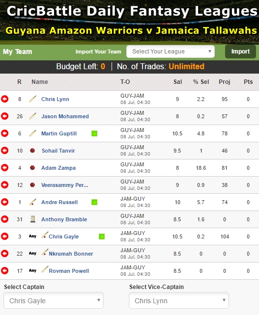 · My XI – Chris Gayle (Captain), Chris Lynn (Vice-Captain), Sohail Tanvir, Andre Russell, Jason Mohammed, Adam Zampa, Veerasammy Permaul, Anthony Bramble, Martin Guptill, Nkrumah Bonner, Rovman Powell