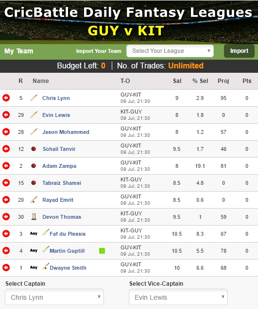 My XI – Chris Lynn (Captain), Evin Lewis (Vice-Captain), Sohail Tanvir, Devon Thomas, Jason Mohammed, Adam Zampa, Tabraiz Shamsi, Rayad Emrit, Faf du Plessis, Martin Guptill, Dwayne Smith