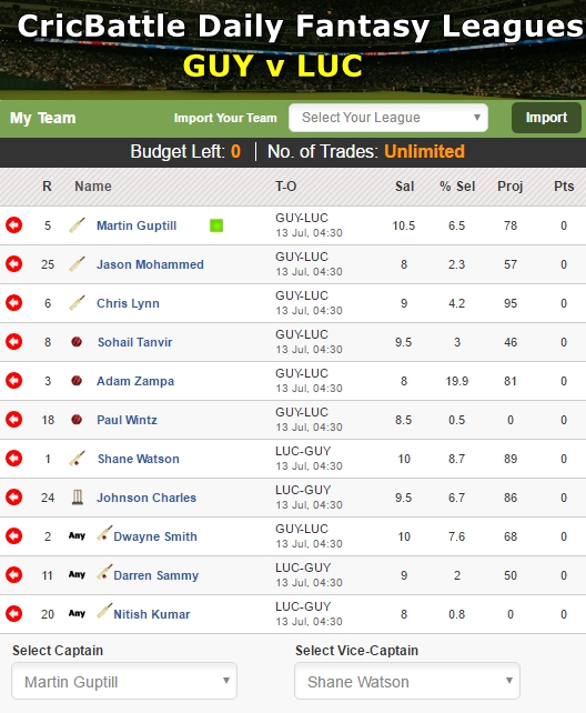 · My XI – Martin Guptill (Captain), Shane Watson (Vice-Captain), Sohail Tanvir, Johnson Charles, Jason Mohammed, Chris Lynn, Adam Zampa, Paul Wintz, Dwayne Smith, Darren Sammy, Nitish Kumar