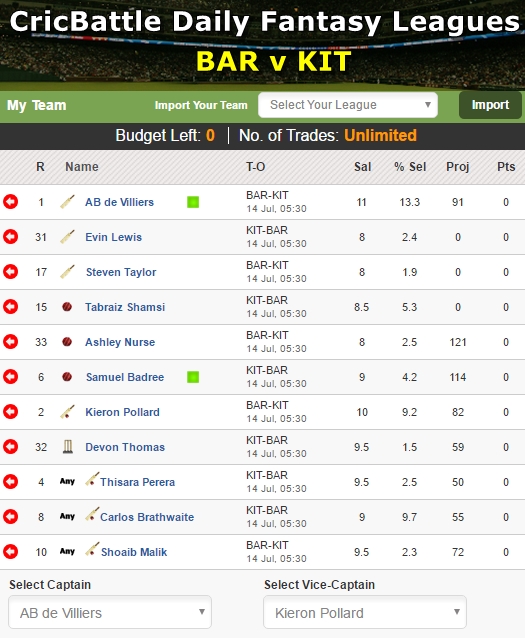 · My XI – AB de Villiers (Captain), Kieron Pollard (Vice-Captain), Evin Lewis, Devon Thomas, Steven Taylor, Tabraiz Shamsi, Ashley Nurse, Samuel Badree, Thisara Perera, Carlos Brathwaite, Shoaib Malik