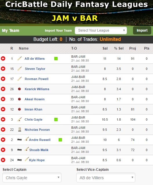 My XI – Chris Gayle (Captain), AB de Villiers (Vice-Captain), Shoaib Malik, Andre Russell, Steven Taylor, Rovman Powell, Kyle Hope, Kesrick Williams, Akeal Hosein, Imran Khan