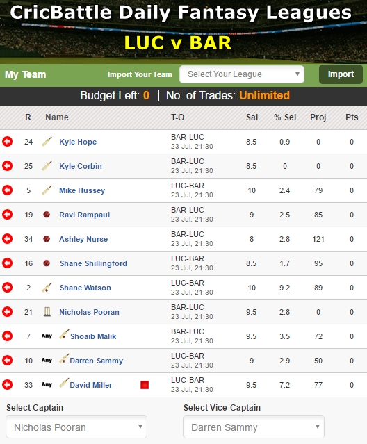 My XI – Nicholas Pooran (Captain), Darren Sammy (Vice-Captain), Shoaib Malik, Shane Watson, Kyle Hope, Kyle Corbin, M Hussey, R Rampaul, Ashley Nurse, S Shilingford, David Miller