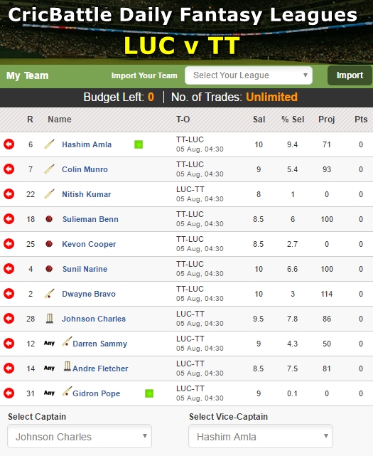 My XI – Johnson Charles (Captain), Hashim Amla (Vice-Captain), Colin Munro, D Bravo, Nitish Kumar, Sulieman Benn, Kevon Cooper, Sunil Narine, Darren Sammy, Andre Fletcher, Gidron Pope