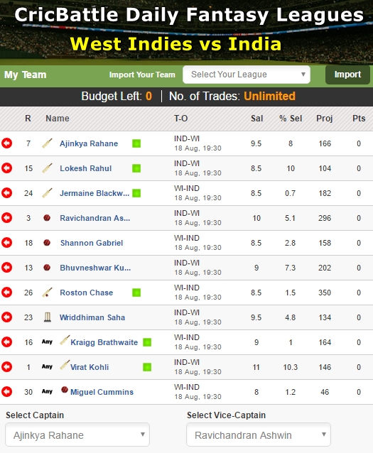 My XI – A Rahane (Captain), R Ashwin (Vice-Captain), S Gabriel, W Saha, L Rahul, J Blackwood, B Kumar, Roston Chase, Kraigg Brathwaite, Miguel Cummins, Virat Kohli