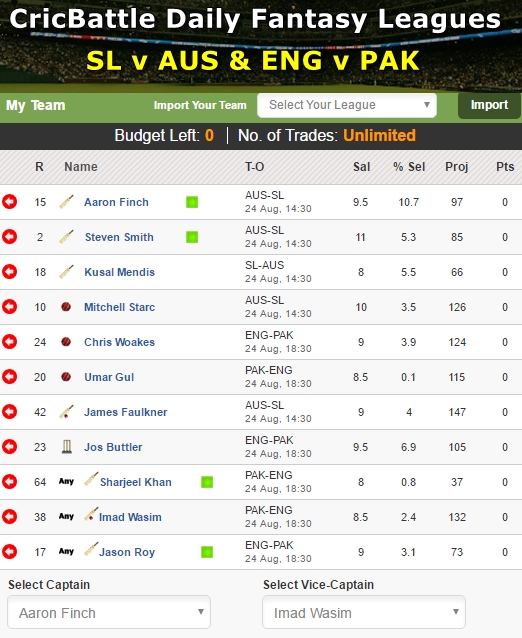 My XI – Aaron Finch (Captain), Imad Wasim (Vice-Captain), Steven Smith, Kushal Mendis, Mitchell Starc, James Faulkner, Sharjeel Khan, Chris Woakes, Jos Buttler, Umar Gul, Jason Roy
