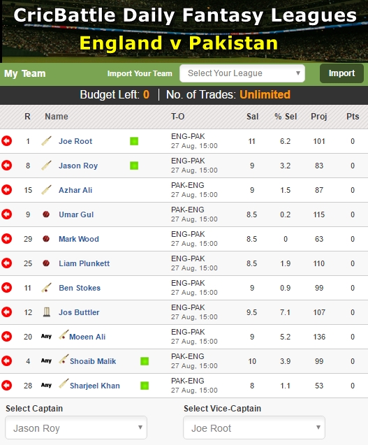 My XI – Jason Roy (Captain), Joe Root (Vice-Captain), Jos Buttler, Azhar Ali, Umar Gul, Mark Wood, Liam Plunkett, Ben Stokes, Moeen Ali, Shoaib Malik, Sharjeel Khan