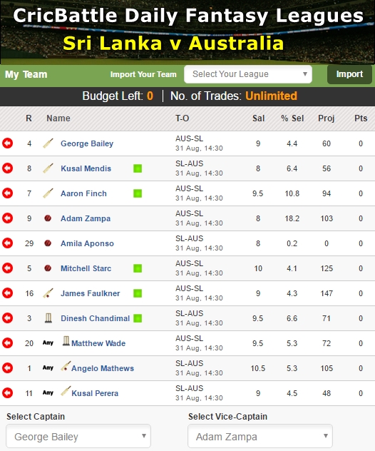 · My XI – George Bailey (Captain), Adam Zampa (Vice-Captain), Amila Aponso, D Chandimal, Mitchell Starc, Kusal Mendis, Aaron Finch, James Faulkner, Matthew Wade, Angelo Mathews, Kusal Perera