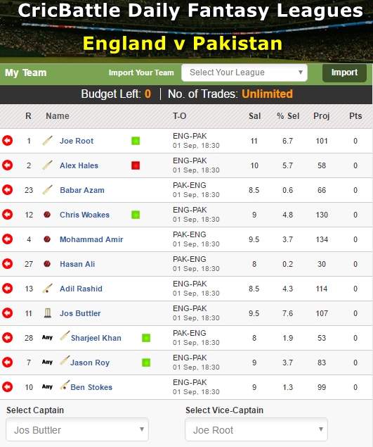My XI – Jos Buttler (Captain), Joe Root (Vice-Captain), Alex Hales, Chris Woakes, Babar Azam, Jason Roy, Mohammad Amir, Hasan Ali, Adil Rashid, Sharjeel Khan, Ben Stokes