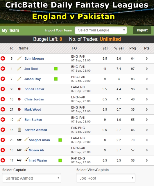 My XI – Sarfraz Ahmed (Captain), Joe Root (Vice-Captain), Eoin Morgan, Sohail Tanvir, Jason Roy, Sharjeel Khan, Chris Jordan, Mark Wood, Ben Stokes, Moeen Ali, Imad Wasim