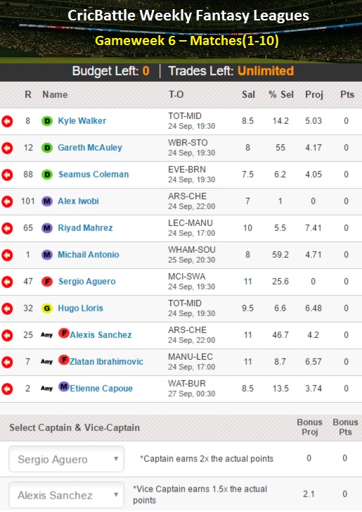 My XI – Sergio Aguero (Captain), Alexis Sanchez (Vice-Captain), Kyle Walker, Gareth McAuley, Seamus Coleman, Riyad Mahrez, Alex Iwobi, Hugo Lloris (GK), Zlatan Ibrahimovic, Etienne Capoue, Michail Antonio.