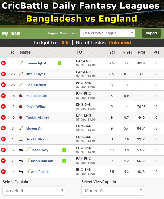 · My XI – Jos Buttler (Captain), Moeen Ali (Vice-Captain), Imrul Kayes, Tamim Iqbal, Ben Duckett, Shafiul Islam, David Willey, Taskin Ahmed, Jason Roy, Mahmudullah, Adil Rashid