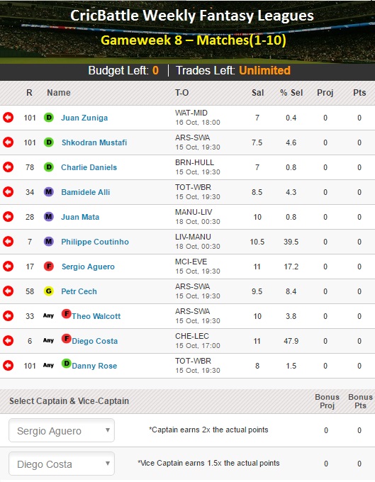My XI – Sergio Aguero (Captain), Diego Costa (Vice-Captain), Theo Walcott, Petr Cech(GK), Juan Zuniga, Shkodran Mustafi, Charlie Daniels, Bamidele Alli, Juan Mata, Philippe Coutinho, Danny Rose.